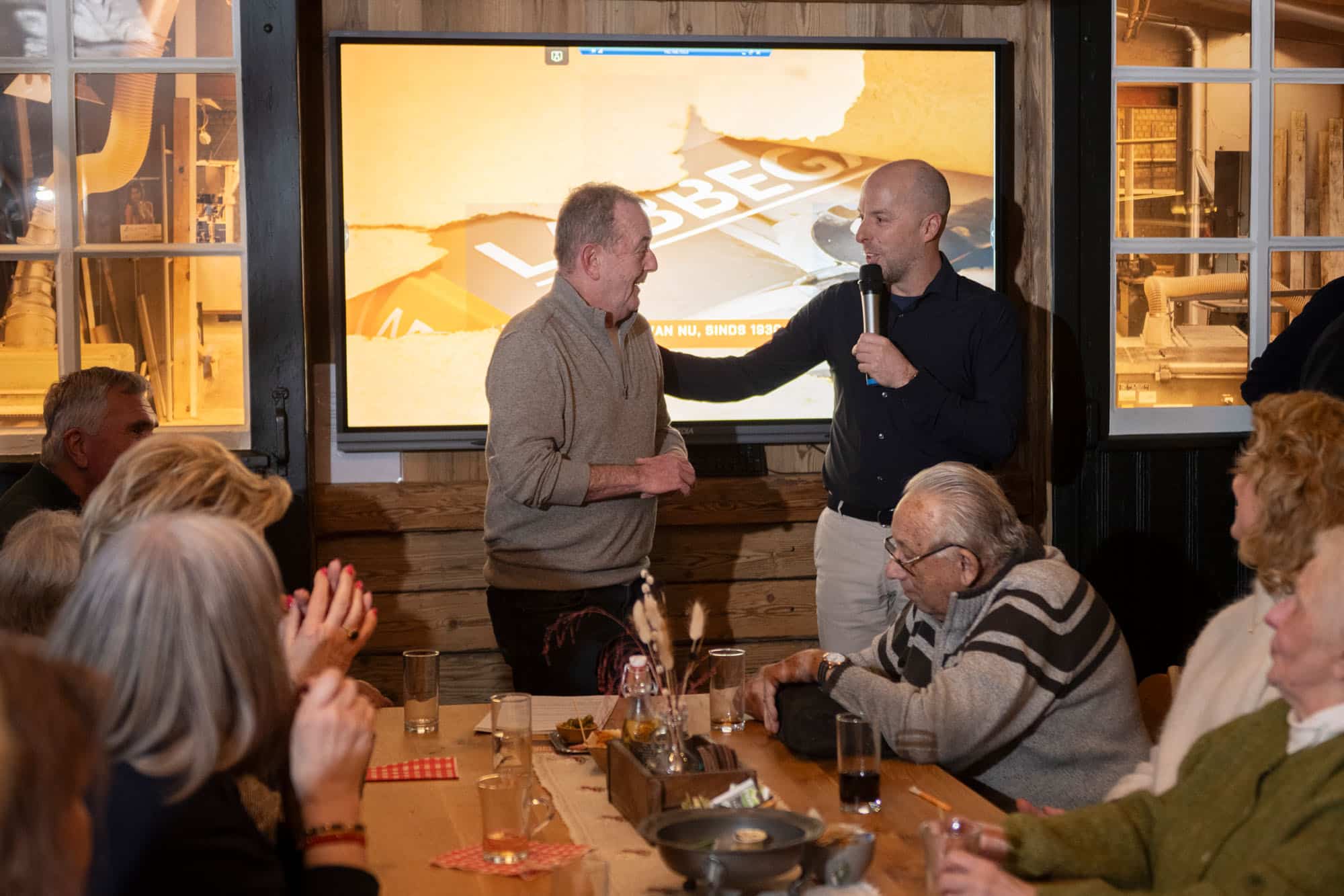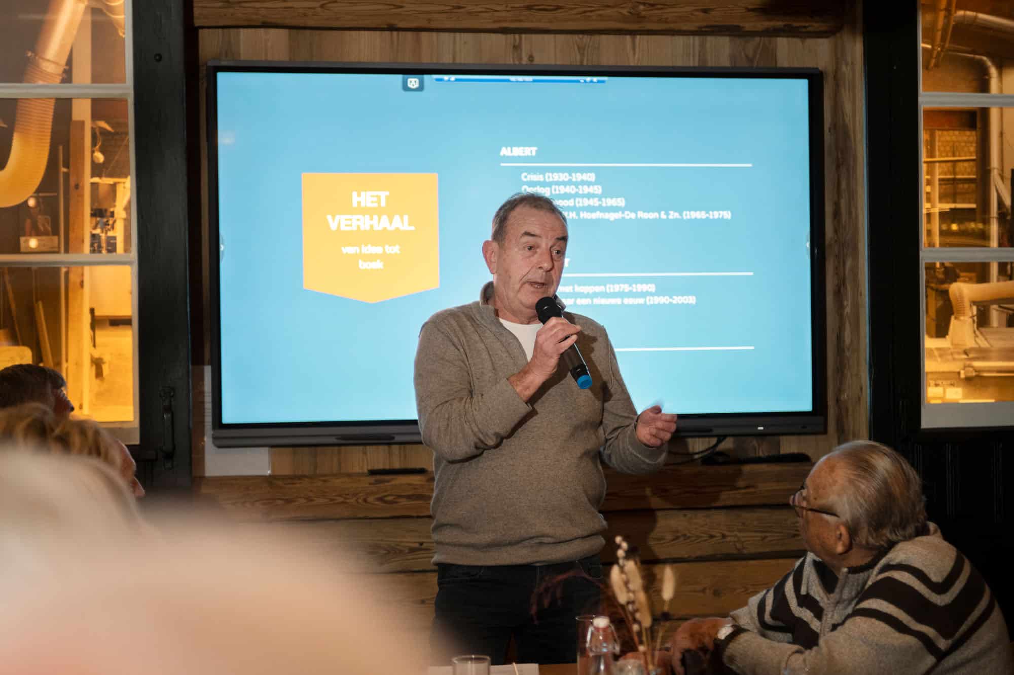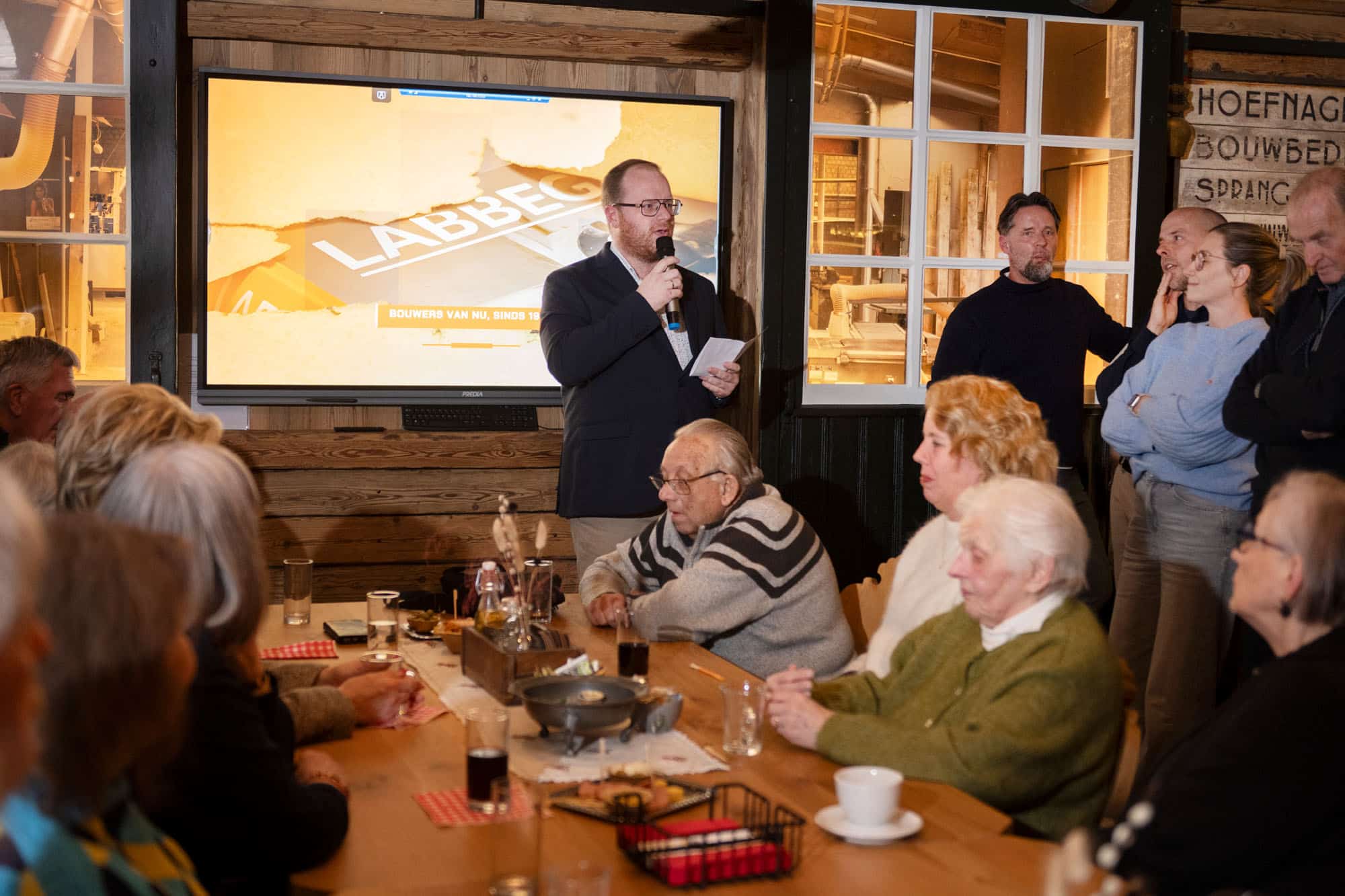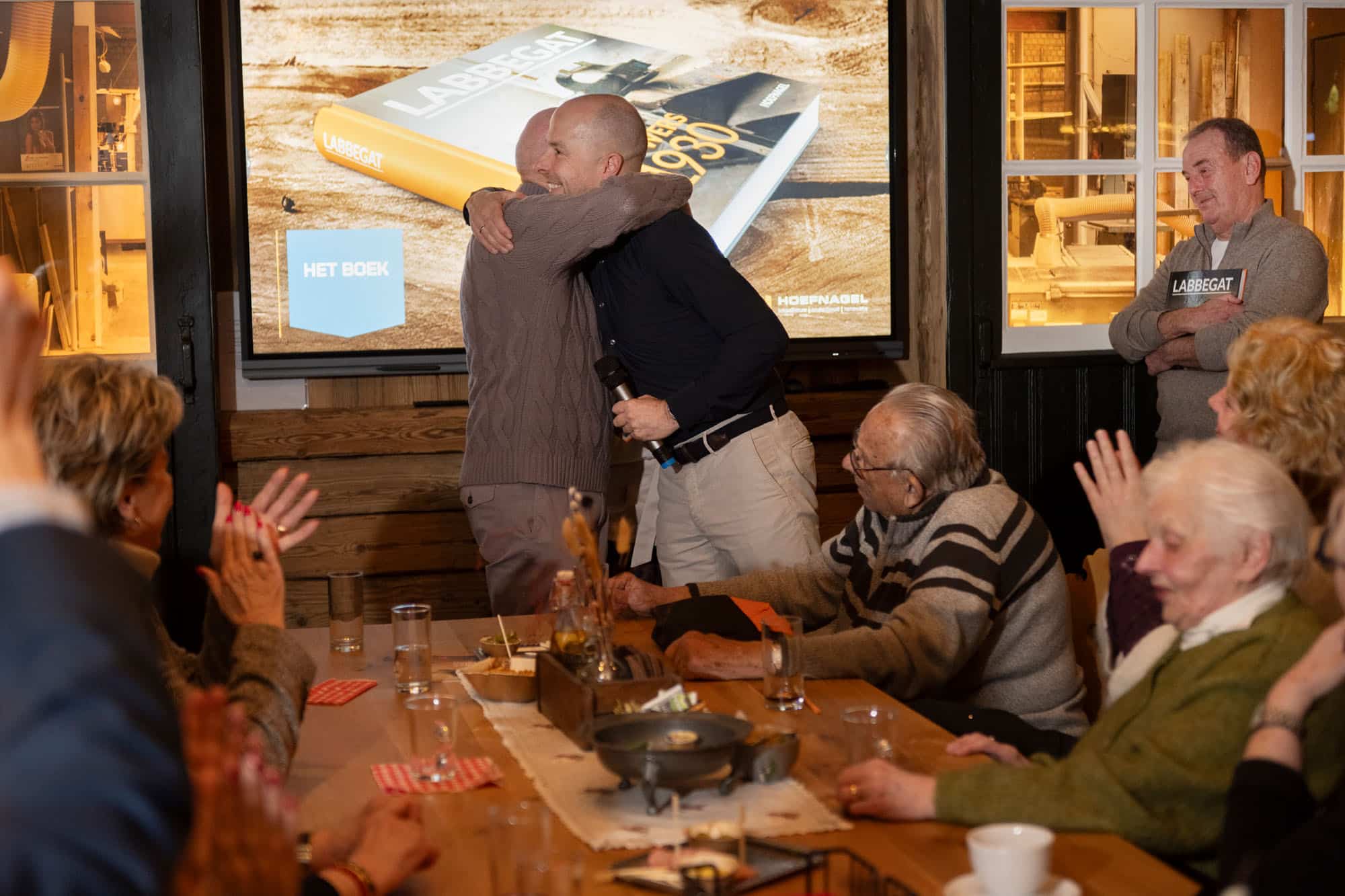 Na een woordje van wethouder Laros van Gemeente Loon op Zand nam auteur Kleijngeld de aanwezigen mee in het verhaal achter de totstandkoming van ‘Labbegat’: de zogeheten Hoefnagel-formule en drie generaties door de jaren: 1930–1970, 1970–2000 en van 2000 tot nu. Rens (88) en Piet (73), dochter en zoon van oprichter Albert, en kleinzoon Alexander (49) ontvingen het eerste exemplaar.